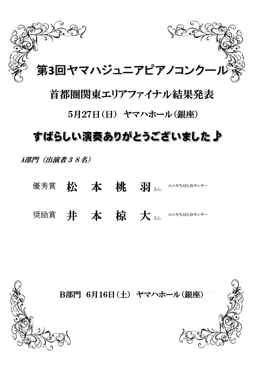 結果報告:ヤマハ ジュニア ピアノコンクール 首都圏関東エリアファイナル A部門
