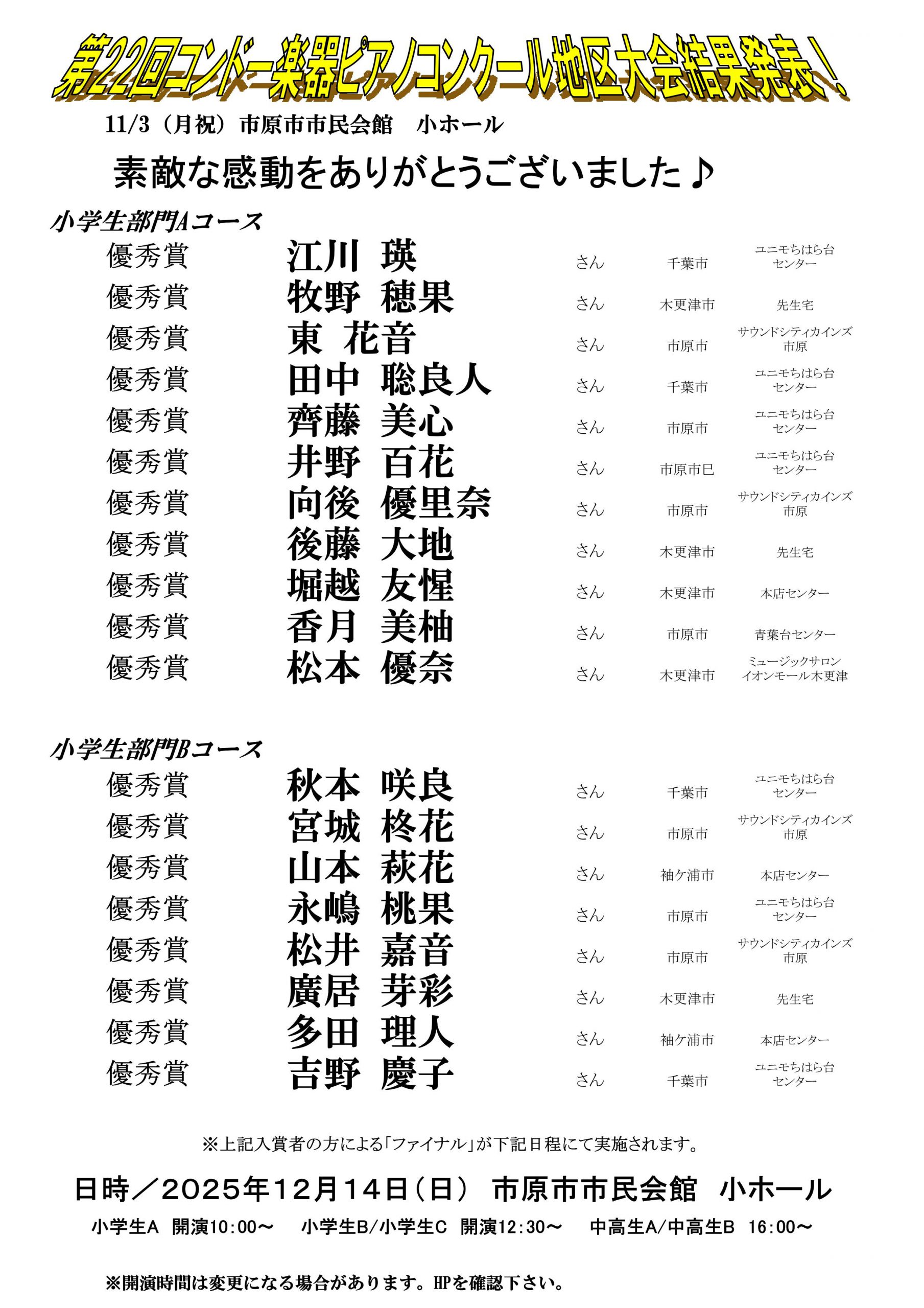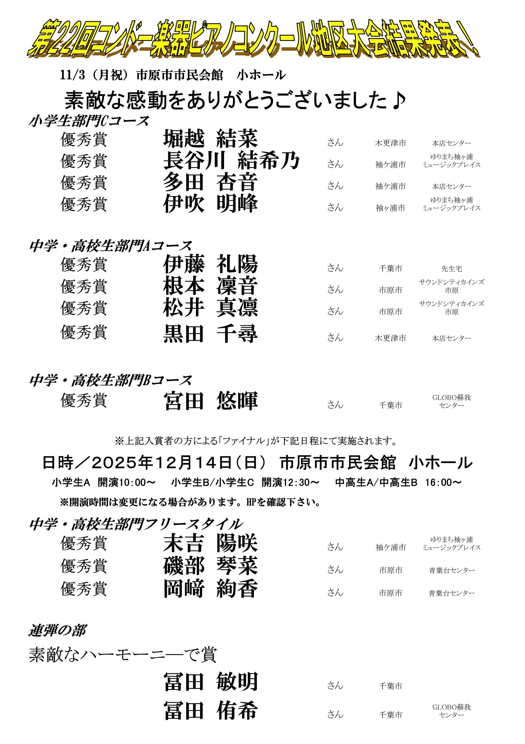 • 2025年10月28日第22回コンドー楽器ピアノコンクール木更津地区大会 結果発表