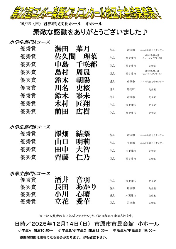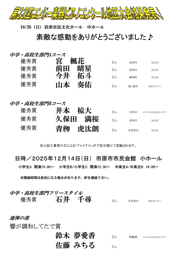 第22回コンドー楽器ピアノコンクール木更津地区大会 結果発表